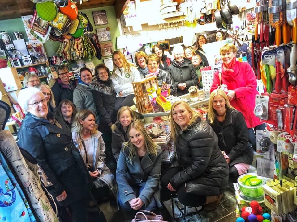 Once the ladies were at our shop, we served them chocolate covered strawberries from Spruce Grove’s Orchard Berry, gave them a little sip of bubbly, then as a group of 22, we walked two blocks down the street and COMPLETELY SURPRISED the wonderful owner of Gifts & Gadgets by walking in and singing JINGLE BELLS! It was agreed upon outside the store that was the only song we definitely knew all the words to lol!)!!